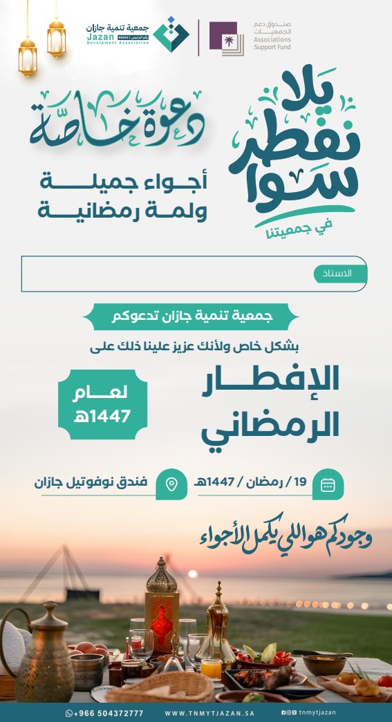 جمعية تنمية جازان تدعو للإفطار الرمضاني لعام 1447هـ